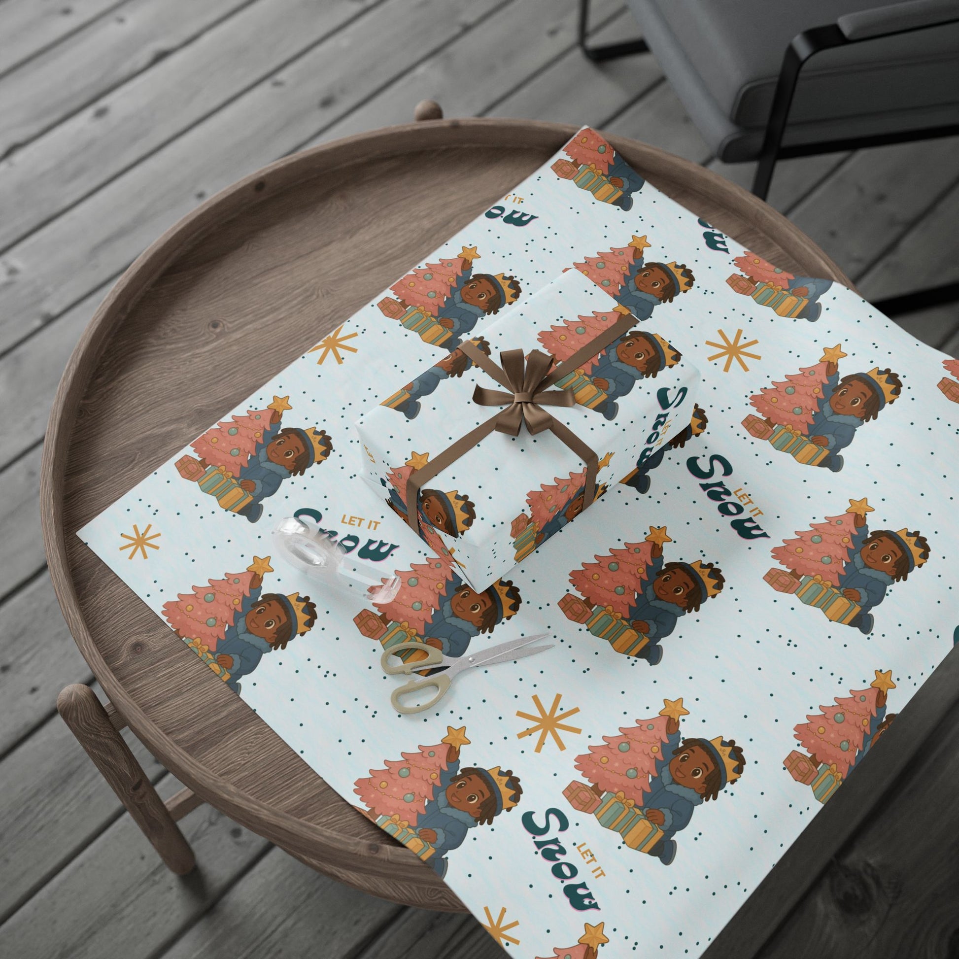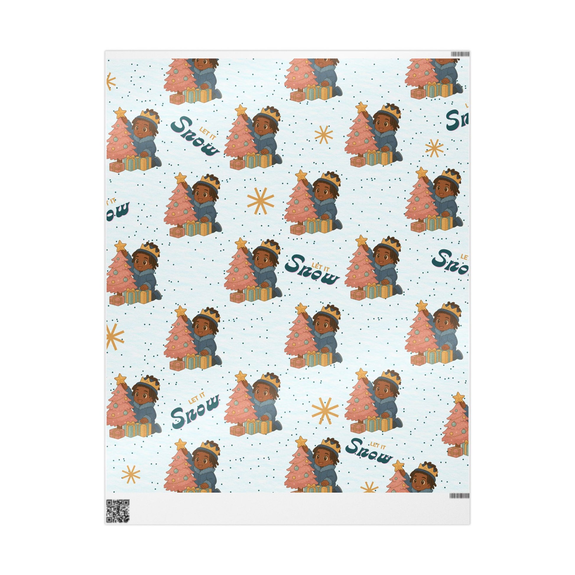 Step into a soft winter wonderland with this charming “Let It Snow” wrapping paper featuring a sweet little king decorating his pastel Christmas tree. Dressed in cozy winter blues with a golden crown and surrounded by snowy dots, starbursts, and softly wrapped gifts, he brings peaceful holiday joy to every package. With its high-quality finish and enchanting patterns, it's particularly relevant during Christmas, birthdays, and special events, making every wrapped present a celebration in itself!